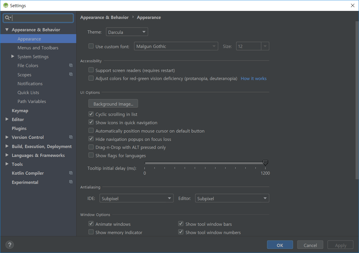 Settings 창에서 Appearance & Behavior → Appearance 를 클릭해주시면 아래와 같은 창이 나타납니다.