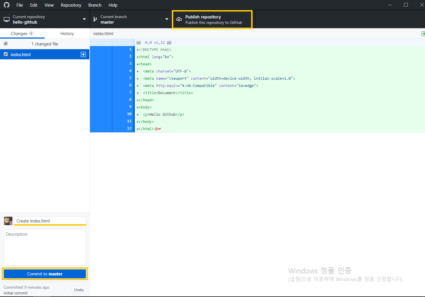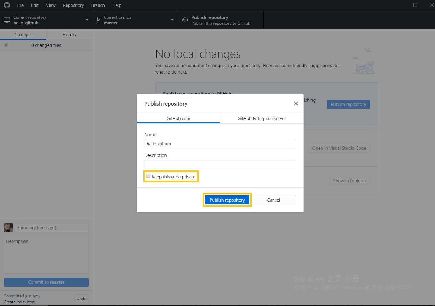 Commit to master를 클릭하신 후에 Publish repository를 클릭해주세요.