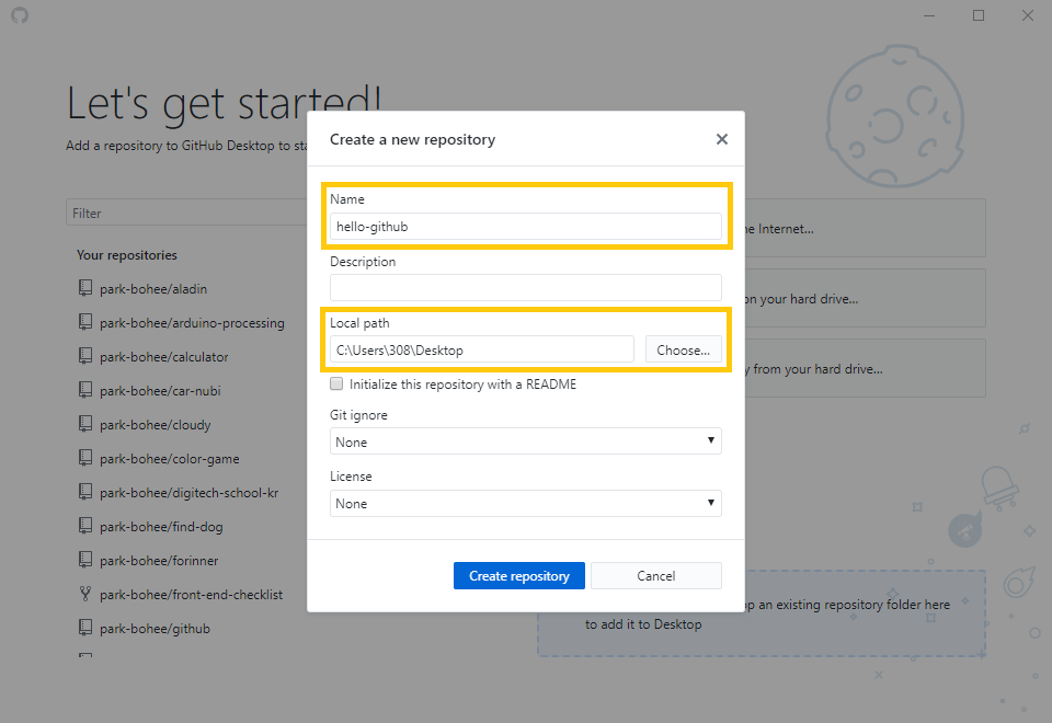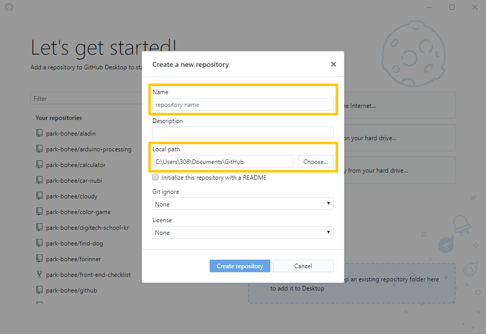 새롭게 만들 프로젝트에 이름과 경로를 지정 후 Create repository를 클릭해주세요.